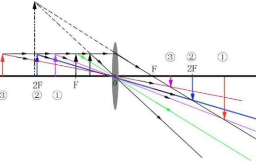 3、当物体为虚物,凹透镜到虚物的距离为一倍焦距(指绝对值u=f)时,成像于无穷远。