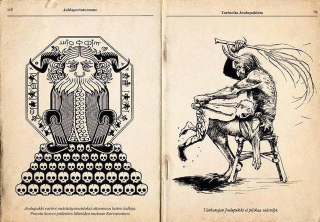 以上是大众口中的圣诞老人的传说,但是如果翻开古代欧洲的历史,那尘封在夜魅传说之中的圣诞老人形象并不是像我们所想的这样慈祥、仁爱,反而是很恐怖、渗人的,他顶着羊角,披着动物皮,带着树皮面具,他原名叫做Nuuttipukki,翻译过来就是讨要礼物的魔鬼。