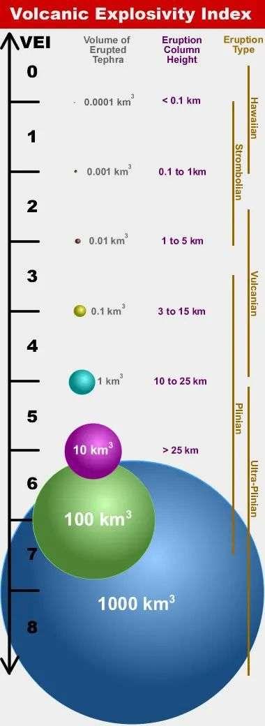 正如地震的震级一样,火山爆发指数也是衡量火山爆发强度大小的分级,其中火山爆发指数最小的是1级,喷发体积大约是0.00001~0.001立方千米、喷发柱的高度大约为0.11千米,相当于地震6.6级。火山爆发指数最高的是8级,喷发出的体积大于1000立方千米,喷发柱的高度大于25千米。
