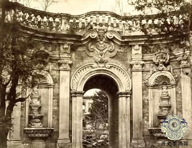 圆明园之花园门,由德国人恩斯特.奥尔末拍摄于1873年。花园门是连接万花阵的入口,透过门洞可以看见远处万花阵入口两边的石柱以及中央的西式亭,花园门无论整体的外观还是大理石构件的线条都与中国传统建筑风格迥异。