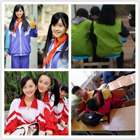 如下图所示,都是2010年左右,尝试的各种鲜艳配色的校服,有闪电紫、亮眼红白、西红柿炒蛋、万花丛中一点绿,颜色搭配都很大胆,让学生更加接受无能。