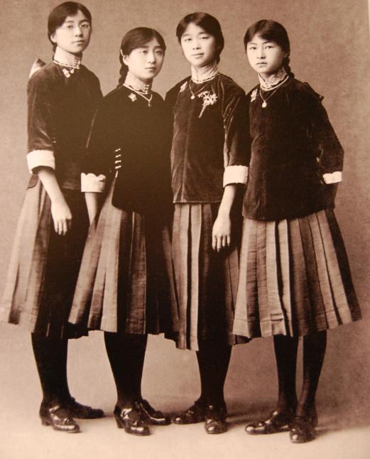 下图是民国时期,北京培华学院的女生校服,其中最后边的则是第一才女林徽因,那时的校服,是漂亮的中山装+中长度的百褶裙,既好看又有气质,而且非常有民国时期的特色,一眼看上去就非常有书卷气息,就放在现在也颇受欢迎。