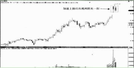 (3)处于顶部的两阴夹一阳是很重要的卖出信号。