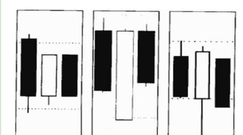 (2)两阴夹一阳的三根K线实体要略长一些,而且长短大体相当。