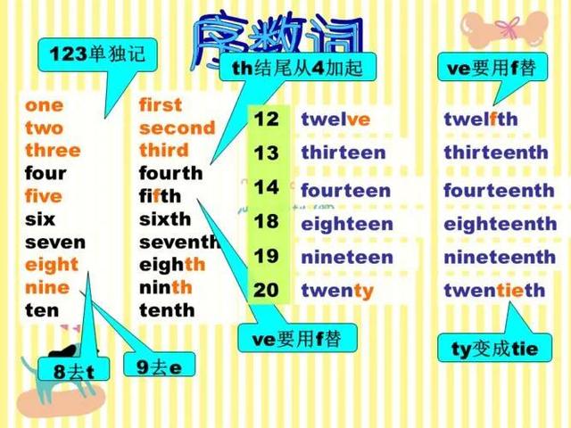 序数词变化规则口诀是:基变序,有规律,词尾字母tdd。八减t,九减e,f要把ve替。ty把y变成i,记住th前有个e。