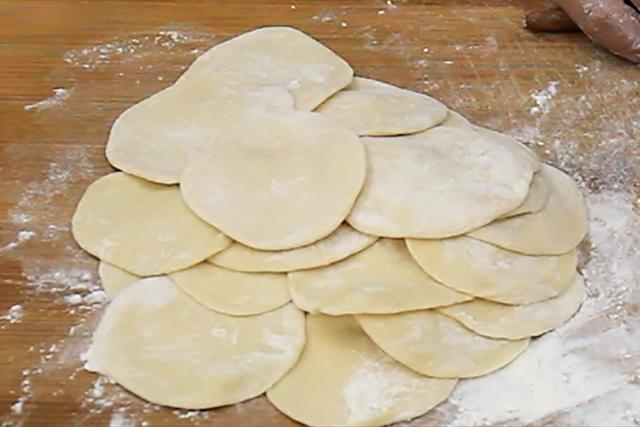 4.这个时候面饧好了,在案板上撒上面粉,把面团取出搓成长条,揪成大小均匀的面剂子,在面剂子上撒上干面粉,使每一个剂子都均匀裹上面粉,这样擀饺子皮的时候,不容易粘擀面杖和案板,把面剂子摁扁,擀成中间稍厚边缘稍薄的饺子皮,这样包出来的饺子不易破皮露馅。