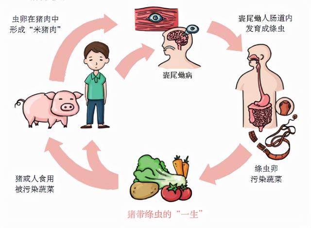 猪囊尾蚴主要寄生在骨骼肌、心肌、脑、眼处。在生猪屠宰检验过程中,一般通过咬肌和腰肌剖检进行检查。猪囊尾蚴在70℃10秒即可杀死,因此猪肉加工至熟后,也可杀灭囊尾蚴。普通消费者在购买猪肉时,发现瘦肉间镶嵌有白色米粒状物质,要引起警惕,不要食用。在食用猪肉时,不能生食,应煮熟后食用;切割猪肉的案板和其他可直接入口食用的食品不在一个案板上,即切割生熟产品要分开。