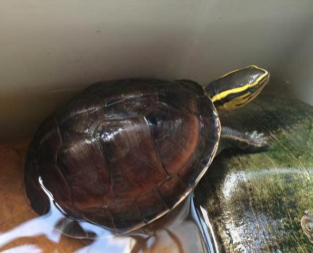 安布我们给它归属于半水龟,实际上安布还是比较亲水的,如果甲壳长期太干,还会有爆甲的现象。安布的食性也是很杂的,主要是一些昆虫,小鱼和水果类。成体的时候,安布也是可以长到20-22厘米背甲长度的。