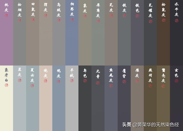 黑灰系:红青、灰鼠、元青、玄色、缁色、黑扪、红扪、胶青、仟张灰、鼠毛、铁色、羊绒、鹰背、真朱墨、朱墨、青灰、水灰、桃灰、银灰、菜灰、墨灰、并灰、老灰、铅灰、芦灰、铁灰、大理石、石板灰、玫瑰灰、银鼠灰、橄榄灰、月灰、瓦灰、灰黑、绿灰、蓝灰、穹灰、靠灰、猬灰、晓灰、烬灰、鹑灰、鹤灰、鸥灰、星灰、尘灰、嫩灰、垩灰、浅灰、中灰、深灰、砚灰、紫灰、象灰、雁灰、正灰、灰米、米灰、灰黑、皂色、红皂、长石灰。