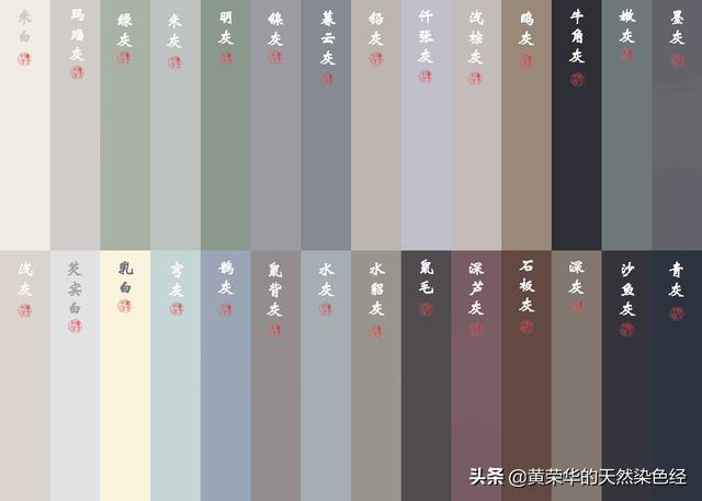白色系:草白、灰白、米白、茧白、象牙白、银白、粉白、胡粉、蚌肉白、蜡白、荔肉白、荷花白、鱼肚白、菊蕾白、汉白玉、云峰白、莲子白、莲瓣白、月影白、芡实白、东方亮、缟素、洁白。(23)
