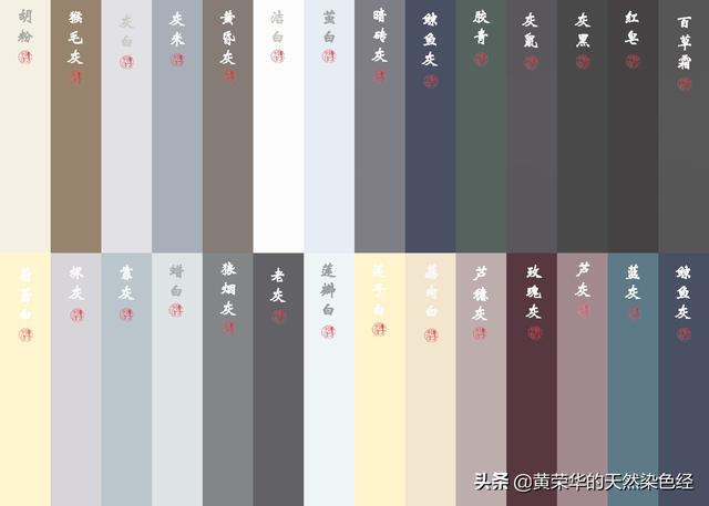 珠母灰、淡松烟、百草霜、淡绿灰、淡蓝灰、淡铁灰、浅绿灰、深芦灰、犀角灰、猴毛灰、蛛网灰、鼠背灰、黄昏灰、暮云灰、蝙蝠灰、蟹壳灰、鲸鱼灰、鸽子灰、燕羽灰、水牛灰、牛角灰、古鼎灰、瓦罐灰、田鼠灰、沙鱼灰、松鼠灰、松烟灰、河豚灰、夏云灰、海豹灰、海参灰、珍珠灰、乌贼灰、狼烟灰、龟背灰、钟乳灰、水貂灰、相思灰、浅棕灰、中棕灰、灯草灰、织锦灰、百龄鸟灰、淡玫瑰灰、镍灰、鹊灰、鱼尾灰、斑鸠灰、玛瑙灰、暗砖灰、橄榄石灰。(113)