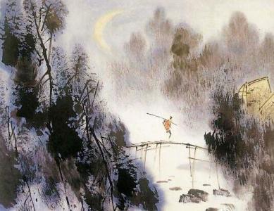 颔联“鸡声茅店月,人迹板桥霜”,写的是鸡鸣之声从月色朦胧下的茅屋小店里响起,行人的足迹印在那木板桥的白霜上。此二句紧接首联,未用一个虚词,也未用一个动词,全用名词造句, 但给人以动感,既写出了早行所见的景,也表现了旅客征途的苦,还有那莫可名状的愁,实在销人魂魄。当然妙就妙在诗人并没有直说出此种感受,却让你从字里行间体味到。千百年来,此二句已成为“状难写之景如在目前,含不尽之意见于言外”的奇对绝唱,令众多学子拍案叫绝!