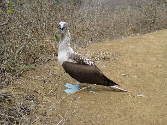 蓝脚鲣鸟,鸟如其名,有一双蓝色的大脚丫子,这也是它们最大的特色(其实鲣鸟属还有一种红脚鲣鸟也挺有特色)。