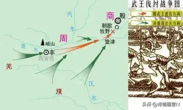 武王十一年,武王命姜太公为元帅,统领兵车三百乘,虎贲(冲锋兵、猛士)三千人,士卒四万五千人,出兵东进。在距朝歌七十里的牧野,武王召开了誓师大会,历数纣王听信妇言、不祭祖宗、不任亲族、招集四方罪人与逃奴等罪行。这就是历史上有名的“牧誓”。此举激起军民共愤,号召各路诸侯同仇敌忾,共同灭纣。
