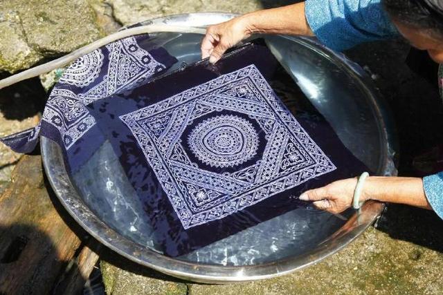 最后一步是去蜡,将布料渍染后用清水反复冲洗,再放入锅中用清水煮沸,等到蜡溶化后,捞出用清水清洗,图案便色彩分明,显出花纹。