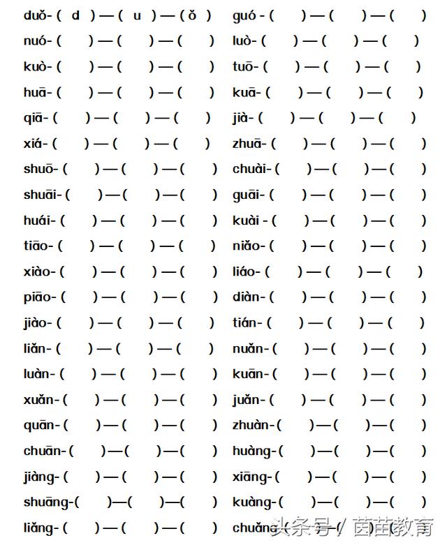 今天,我们针对三拼音节出了一张练习。只要孩子能够完整地写出下面的这种三拼音节拆分,在区分两拼音节和三拼音节的时候就没有太大的问题。当然,这一份练习也可以作为早读的材料,每天拿出来读一读,多多少少会有些帮助的。