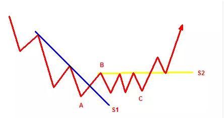 股价在下跌的末期,当突破明显的下跌趋势线(S1)后形成低点A与高点B,但是完整的低位ABC并没有成立,因为C点具有不确定性且股价总是不能突破B点的水平压力位,有时高于A点有时低于A点,形成一定的震荡整理,经过一段时间的整理之后出现了一个底部形态(或上升三角形或箱体),当某一天股价有效突破S2线之后打开了向上的空间,这时候我们可以积极做多,及时跟进。