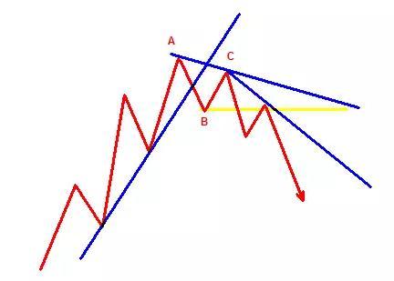 高位ABC结构形成于上升趋势结束后,先是高点C无力克服高点A,A是最高点,C是次高点,之后市场向下跌破了低点B,从而形成了下跌趋势。这是符合道氏理论的高点逐步降低的原则,当跌破B点时,则下跌趋势成立。判断下跌趋势的形成。