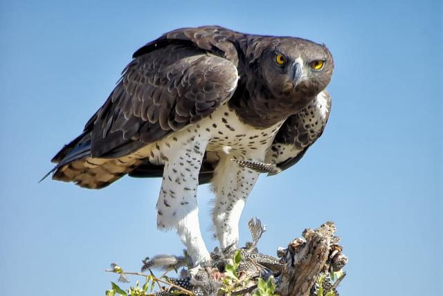 猛雕翼展2.6米,是非洲最大的猛禽。这是一种非常强壮的鸟,它甚至可以用爪子把一个成年人从地上抓起来。据估计,猛雕重约6.5公斤。从塞内加尔到索马里和南部的开普敦,这种雄伟的鸟可以在撒哈拉以南非洲的开放和半开放栖息地找到。它们喜欢捕食大型哺乳动物,如小型羚羊、猴子、爬行动物和其它大型鸟类,但不吃食腐食物。农民们经常猎杀猛雕以作惩戒,因为众所周知,它们会威胁到家畜的安全。大多数时候,这些鸟把巢穴建在它们可以直接飞出去的地方,出现两个巢穴的猛雕是相对罕见的。