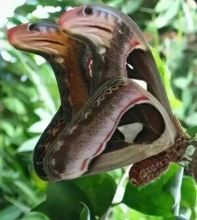 据悉,此次事件就发生在不久之前,当时发现它也纯属偶然。广东韶关新丰县司茅坪林场的工作人员正在进行日常巡山,然后就在一处林木上看到了一长得十分恐怖的生物正在煽动翅膀。从外形来看翅膀上有两个蛇头,而全身花纹遍布,但是仔细一看它像蛇但又不是蛇,毕竟蛇也并不会飞。之后拍摄下了照片,经过最终专家鉴定得出:原来它就是乌桕大蚕蛾!