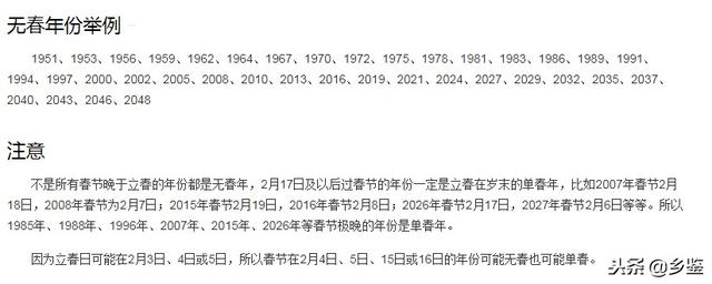 其实,寡妇年的出现,只是公历和农历两种历法之间的前后错位,它并不会影响四季变化,也不是说没有“立春”节气,这一年就没有春天。