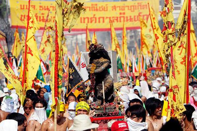 每年九月普吉岛都会举行素食节,节日的时候,每个寺庙都会挂上灯笼,象征着节日开始了,人们要穿着朴素,不穿颜色鲜艳的衣服,不吃肉不饮酒,还会举行庆祝活动和烟花表演。