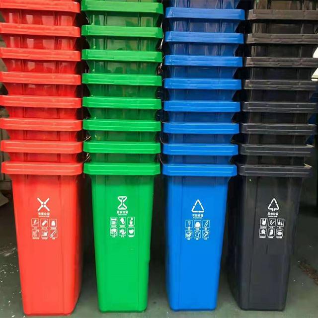 在多种塑料垃圾桶组合的情况下,绿色代表厨余垃圾,厨余垃圾可以作为植物养分的肥料使用,土壤掩埋后可被大自然微生物和植物分解吸收,起到废物再利用的作用。主要包括:米饭和面粉食物残渣、蔬菜、动植物油、肉骨等,化学成分,淀粉、纤维素、蛋白质、脂类和无机盐。