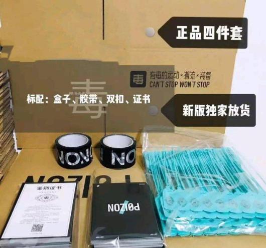 为了解决球鞋市场假货泛滥的难题,毒采用“先鉴别,后发货”的交易模式,其还有一套专属于自己的鉴定标准,即防伪四件套:得物鉴别证书、认证鞋扣、包装盒和胶带,同时拥有四件套的商品被称为“过毒”,也即鉴定为真。