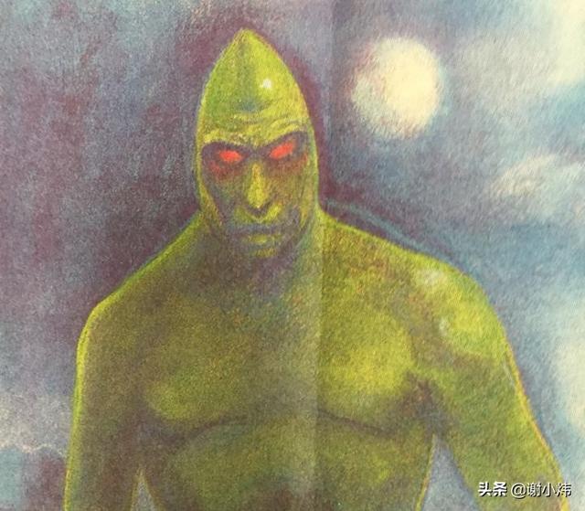 突然在阴影中出现了一个全身布满鳞片的绿色生物,它高度在2.1米左右,三根手指,红色的眼睛。