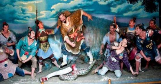 据说刘邦斩蛇前,白蛇忽出人言,说:“你今天欠下的账,总有一天要还的。你斩了我的头,我就篡你的头:斩我的尾,我就篡你的尾。”刘邦一剑将白蛇从正中间斩为两段。所以西汉传到平帝时,白蛇(蟒蛇)投胎王莽,毒杀了汉平帝,篡汉为新。后经光武中兴,平灭了王莽,才又恢复了刘姓汉室,建立了东汉王朝。