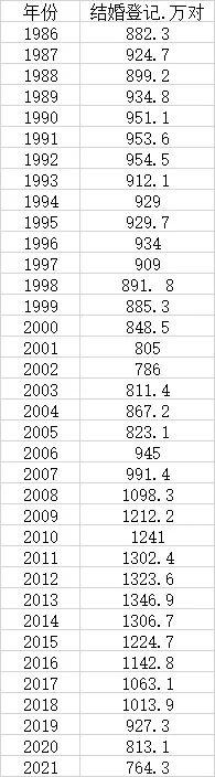 民政部日前公布的《2021年民政事业发展统计公报》(下称公报)显示,2021年全年依法办理结婚登记764.3万对,这是自2003年以来,结婚人数首次低于800万对大关,也是36年来(民政部网站公布有1986年以来的数据)的最低数据。