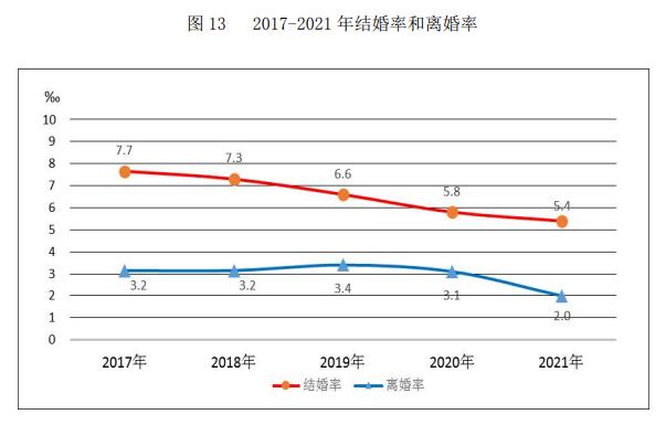 公报显示,2021年,全国共有婚姻登记机构和场所共计4372个,其中婚姻登记机构1069个,全年依法办理结婚登记764.3万对,比上年下降6.1%。结婚率为5.4‰,比上年下降0.4个千分点。依法办理离婚手续283.9万对,比上年下降34.6%。
