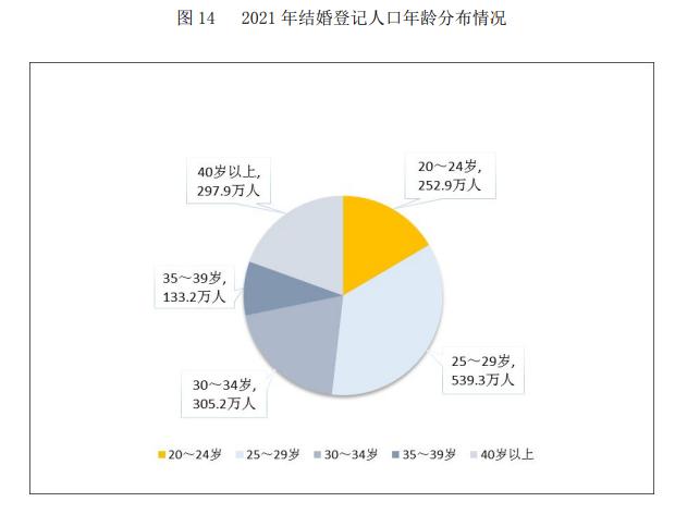 从2021年结婚登记人口年龄分布情况来看,25-29岁年龄段人数最多,为539.3万人;30-34岁年龄段人数其次,有305.2万人;40岁以上年龄段人数为297.9万人,20-24岁年龄段人数有252.9万人,35-39岁年龄段人数有133.2万人。