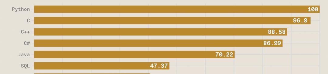 1972年诞生的C语言靠着性能优势和产业界的高度绑定成为了今年的第二名。有趣的是三四名C++语言和C#语言其实也算C语言体系,如果把这个语言家族看成一体,那么C系列语言才是最受欢迎的编程语言。