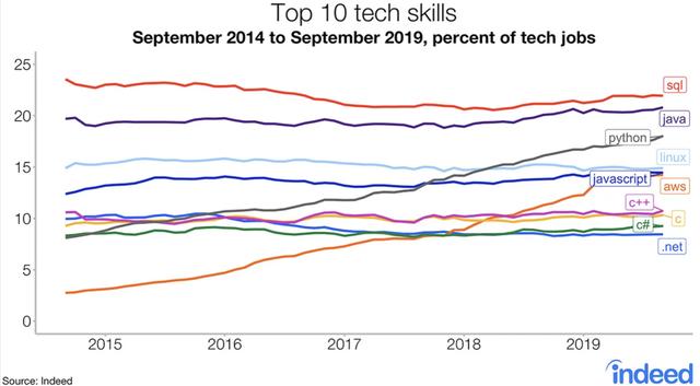 美国电气和电子工程师学会评选人员汇总了网站招聘数据和CareerBuilder职业数据,发现大部分招聘信息中都提到了SQL语言能力。