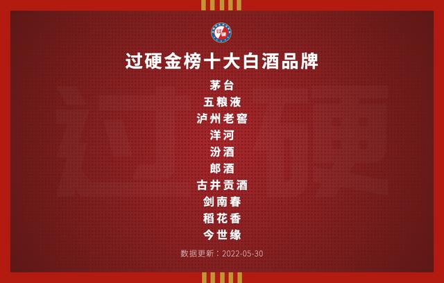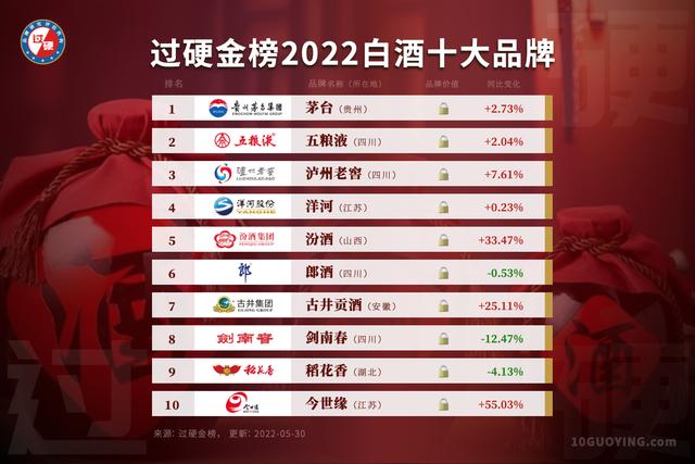 5月31日,过硬金榜携手品牌价值评估机构GYbrand发布了2022年白酒品牌排行榜前十名单。该榜单主要是根据GYbrand品牌价值评估模型,对品牌的认知度、美誉度、忠诚度、差异化、突出性、领导力、传播力、品牌形象、社会责任等若干项指标进行评价分析,最终发布这份最具价值白酒品牌排行榜。