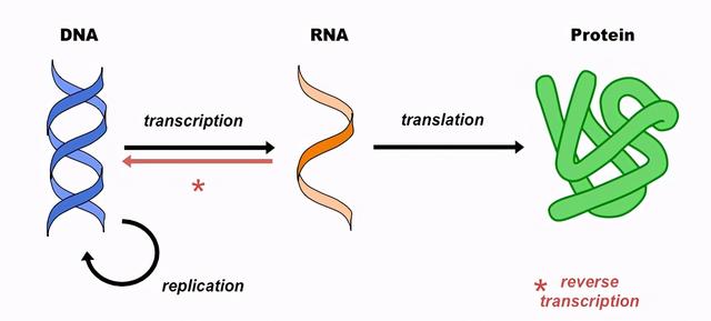 自1957年提出以来,中心法则在科学家的努力下被不断完善。其中,对中心法则最重要的一条修改,源自逆转录酶的发现。1970年,两个独立的研究团队几乎同时发现了RNA肿瘤病毒中存在一种酶(蛋白质),这种酶能够以RNA作为模板,合成DNA。这个发现令人震惊,它不仅证明了RNA中的信息可以逆向流入DNA中,也向我们提出了一个“鸡生蛋”的问题:DNA和RNA,谁首先出现,谁才是生命的源头呢?