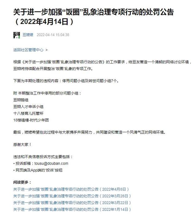 中新经纬4月14日电 14日下午,豆瓣发布了《关于进一步加强“饭圈”乱象治理专项行动的处罚公告》。