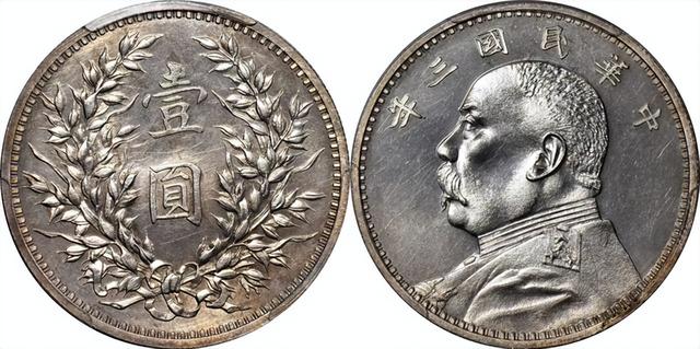 民国三年袁世凯像壹圆银币一枚,精制版,为目前唯一一枚经PCGS认证的民国三年中央版精制币,该币版模初铸,工艺精密绝伦,币边较普币更厚实,边齿及马齿也更为锐利,币面袁世凯髮丝细节纤毫毕现,反面嘉禾纹饰也栩栩如生,底板呈现镜面状态,光可鉴人,币面呈现少见的轻微霜化包浆,极为难得一见。