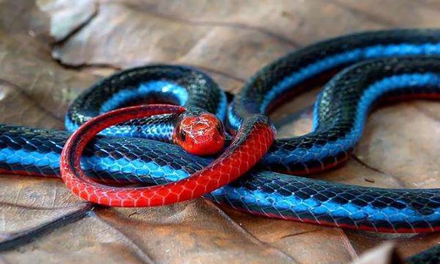 它的头部和尾部均为妖艳的红色,身体两侧分布着极具质感的蓝色花纹。体背以紫褐色为主,掺杂着黑色横带,十分地美丽。