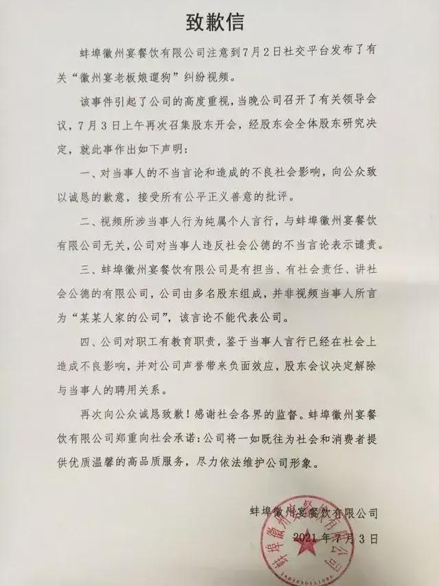 一件遛狗的小事儿,就是因为态度的问题,两个人双双进了拘留所,一个人管吃管住7天,一个人管吃管住3天,咱们想想都可笑。可是这件事情并没有结束。在2021年7月3号的时候,徽州宴官方发布了一封致歉信,大致意思就是说遛狗的这名女士确实是徽州宴的人,由于行为不当已经被公司开除了。这个声明一旦发出来,就可以说明遛狗的这名女士确实是跟徽州宴有关系的。但是这个时候网友们已经关注到了这个事件当中,因为狗的女主人在7月2号说了一句话,自己是徽州宴的老板娘。再结合的这种致歉信来看,致歉信的成语就不足了,哪有说一个企业把老板娘给开除了呢,明显有着糊弄大家的成分在里边,只是想发个声明意思一下,事情就过去了。