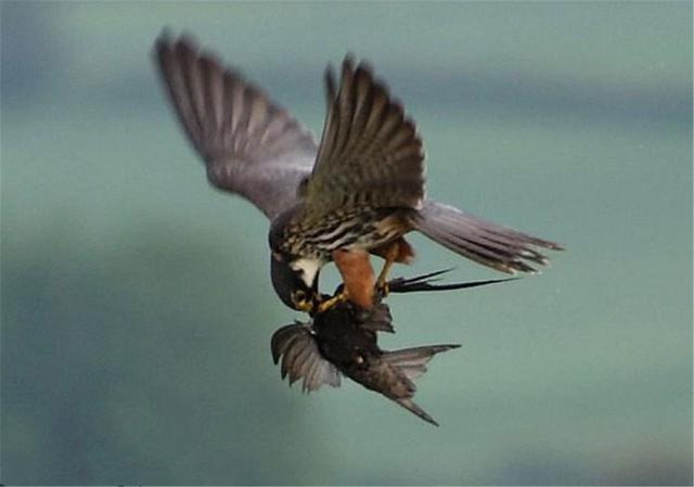 雨燕是飞行速度极快的鸟类,与蚂蚱鹰一样,常在空中捕食昆虫类食物,然而雨燕也是蚂蚱鹰的捕食对象。如果被蚂蚱鹰追上,也只能沦为它的食物。