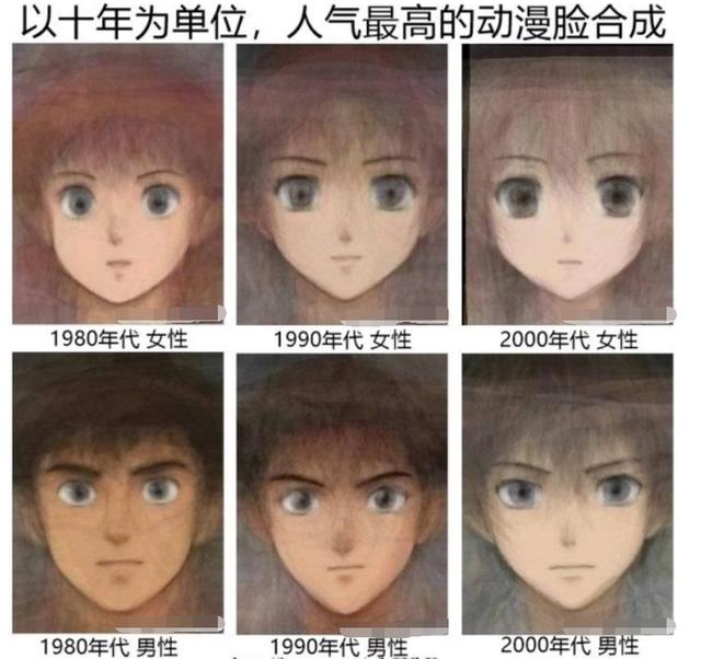 国外大神以十年为单位,将各个时间段人气比较高的动漫脸合成后,发现原来动漫这几十年比较出名的脸也越来越尖了。其实这侧面证明了二次元爱好者和现充们的审美取向是趋于一致的——虽然表面上讨厌网红脸,但不管是二次元还是现充,绝大多数人对于网红脸还是无法抗拒的。或许人类都是这样口嫌体正的生物吧!