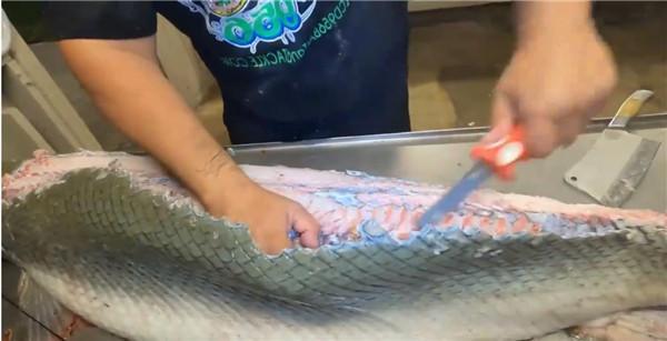 说实话,处理鳄雀鳝也是个不小的工程。鳄雀鳝的鱼皮是一层坚硬鳞片,好像穿着一层盔甲,普通菜刀是拿它没办法的,需要用到砍刀、斧头、剪金属的剪刀和大号杀鱼刀一起配合才行。