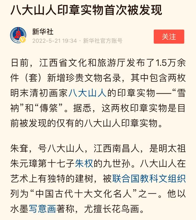 这两日见八大印章一事冲上热搜,惊觉公众对八大山人还是很感兴趣的,因此写下这篇印章背后的故事,让大家对这次发现有个更为完整的了解。