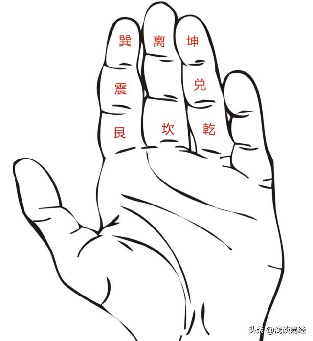 从图中我们可以看到,后天八卦,坎卦在北,离卦在南,震卦在东,兑卦在西,东南为巽卦,东北为艮卦,西南为坤卦,西北是乾卦。为更方便应用我们可以把八卦放在左手手指上