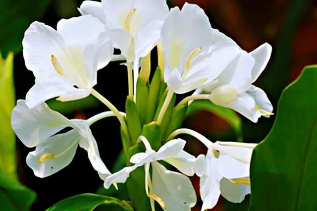 姜花,美丽、白色、芳香。花期如一群美丽的蝴蝶,翩翩起舞,争芳斗艳;无花时郁郁葱葱,绿意盎然。花期从7-8月份开花,花期一直持续到有霜时才会枯萎。
