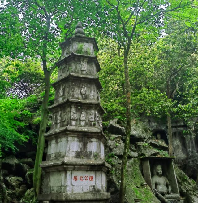 理公塔,又名灵鹫塔,为灵隐开山祖师慧理埋骨处。始建年代无考,宋开宝八年(975)重建,明万历十八年(1590)僧如通主持重修。塔为石砌,六面七层。二层刻有塔铭,三层刻《金刚经》、”光明净域“等,四层以上绵刻佛像。为杭州仅存的明塔。