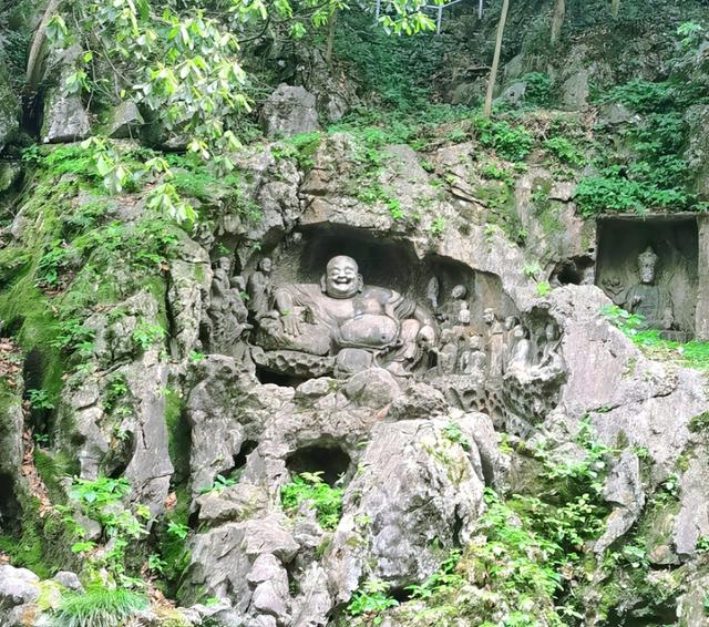 飞来峰还有一景就是最最最值得探索的,那就布袋弥勒佛。是飞来峰佛像群雕中的代表性佛像。其雕刻于南宋(1127-1279),造像龛呈弧形,长9.9米,中高3.3米,两侧高1.5米。为飞来峰像中最大佛像龛,亦为此时期造像的代表作。本尊布袋弥勒佛亦称大肚弥勒佛,高1.9米,肥头丰颊,跣足屈膝,袒腹踞坐,左手执念珠,右手按布袋,两侧的十八罗汉就其山而雕之,姿态各异。其笑容为杭州飞来峰标志。