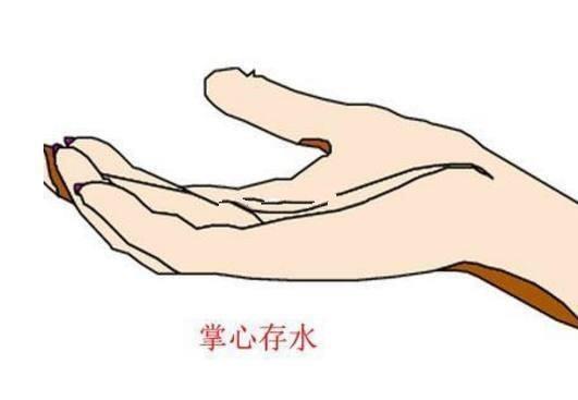 手掌有凹陷,证明此人聚财。可以把手掌弹开伸直伸平放在水平位置上,然后将水倒在手掌中,如果手掌中央有水,代表手掌存水,水越多,证明你的财富越多